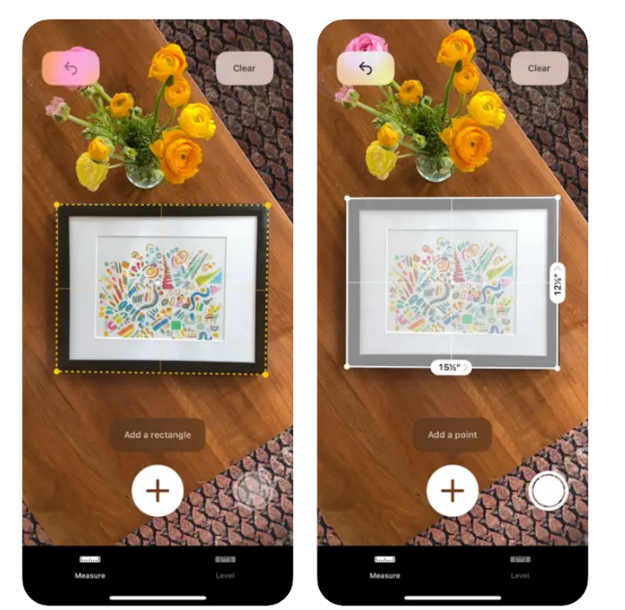 측정 앱을 이용하면 물체를 촬영한 후 길이와 높이를 확인할 수 있습니다. 직사각형 형태의 물체일 때는 자동으로 보정이 되어 편리합니다. 비직사각형 물체의 경우에는 시작점과 끝점을 사용자가 직접 설정해야 하므로 약간의 조정이 필요합니다.