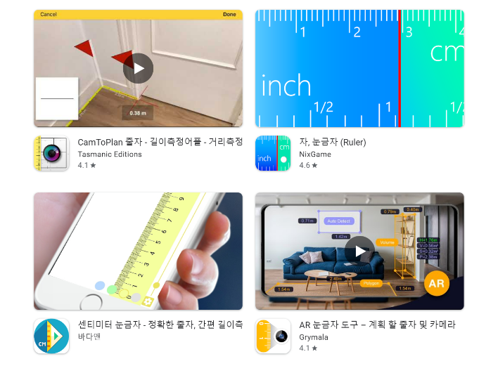 아이폰의 기본 어플인 측정의 기능이 우수하기 때문에 별도의 앱 설치가 필요하지 않은 점은 분명합니다만, 안드로이드 폰의 경우에는 구글 플레이스토어에서 다양한 길이 측정 앱이 존재합니다. 각 앱의 인터페이스와 정확도를 비교해 보시고 본인에게 맞는 것을 선택해 설치하시면 됩니다. 아래와 같은 검색 결과를 통해 여러 옵션을 확인하실 수 있습니다. 구글 플레이에서 길이 측정 앱 검색