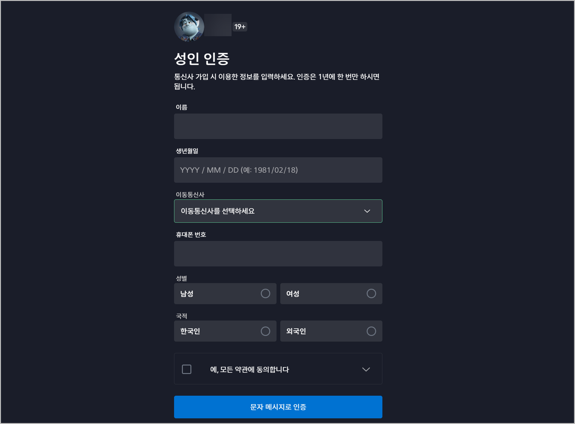이 과정을 통과하면 성인 여부가 확인되며, 선택한 프로필에서 성인 등급 콘텐츠를 볼 수 있게 됩니다. 아래 화면처럼 통신사 본인인증을 안내하는 창이 등장하고, 휴대폰 정보를 입력하도록 구성되어 있습니다.